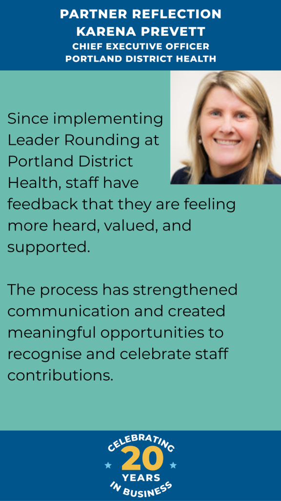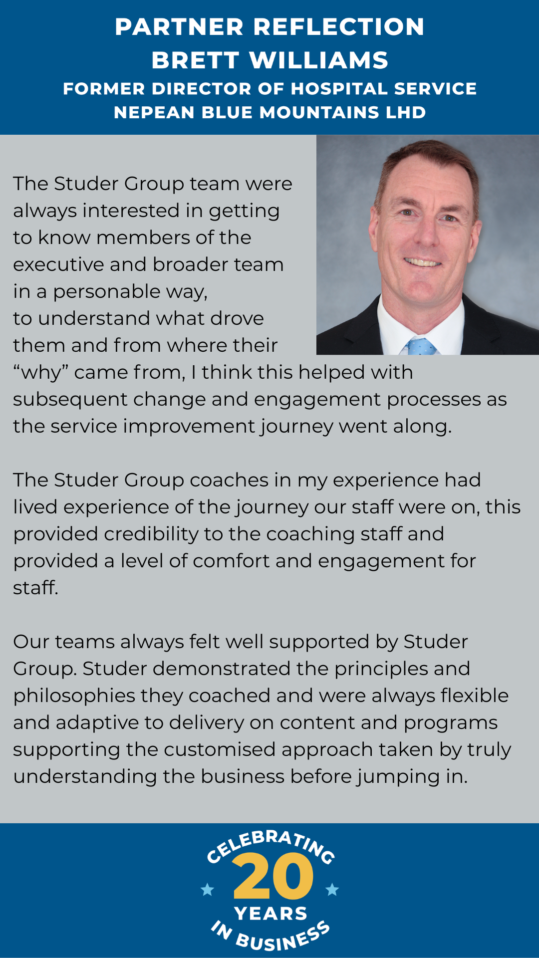 “Northeast Health Wangaratta continues to benefit greatly from a close and valued partnership with the Studer Group. The implementation of our ‘Hardwiring Excellence’ program gives us the necessary framework to drive our Vision: to be recognised leaders in rural health care. We have experienced significant improvement in all KPIs since implementing the Studer program, and we commend the consistently high standard of support and coaching we continue to receive. I strongly recommend the Studer program to CEOs who want to lead sustainable change and transform organisational culture.”