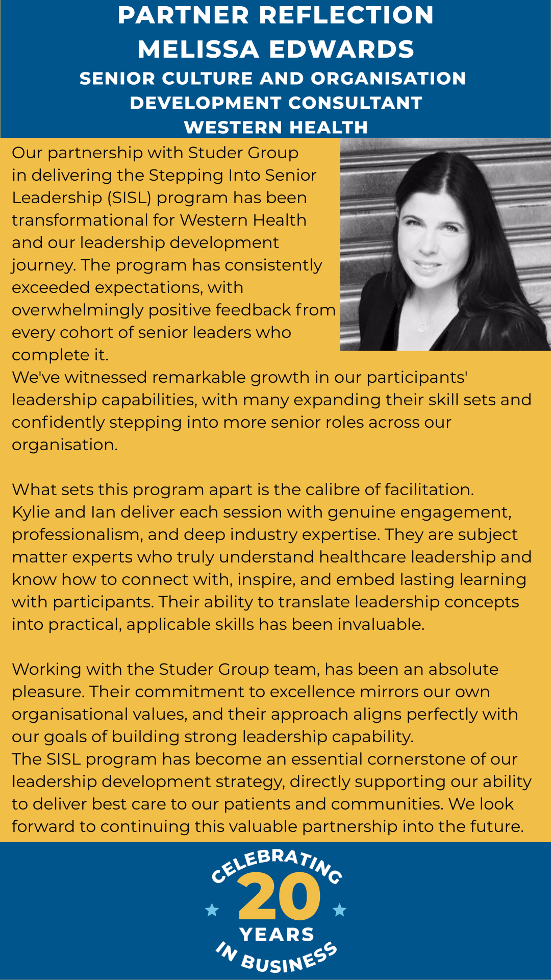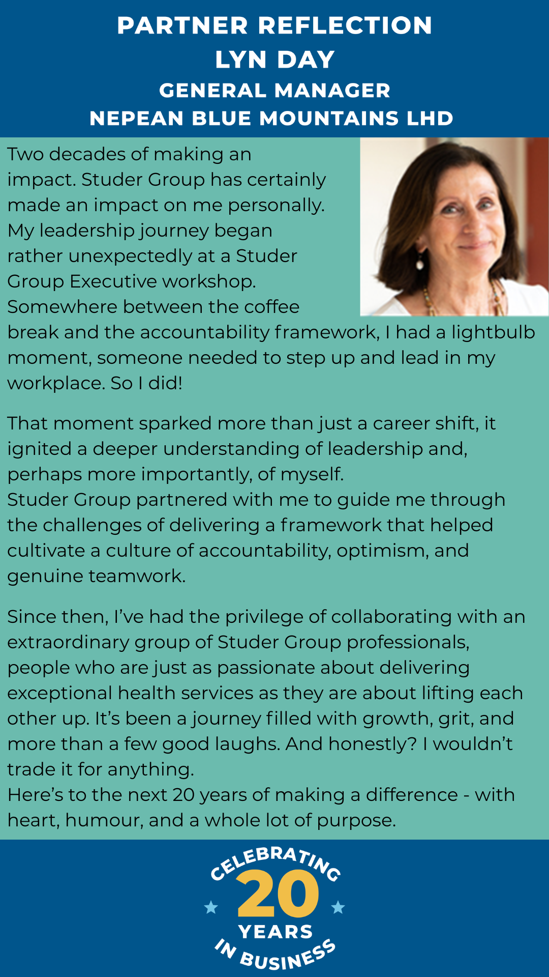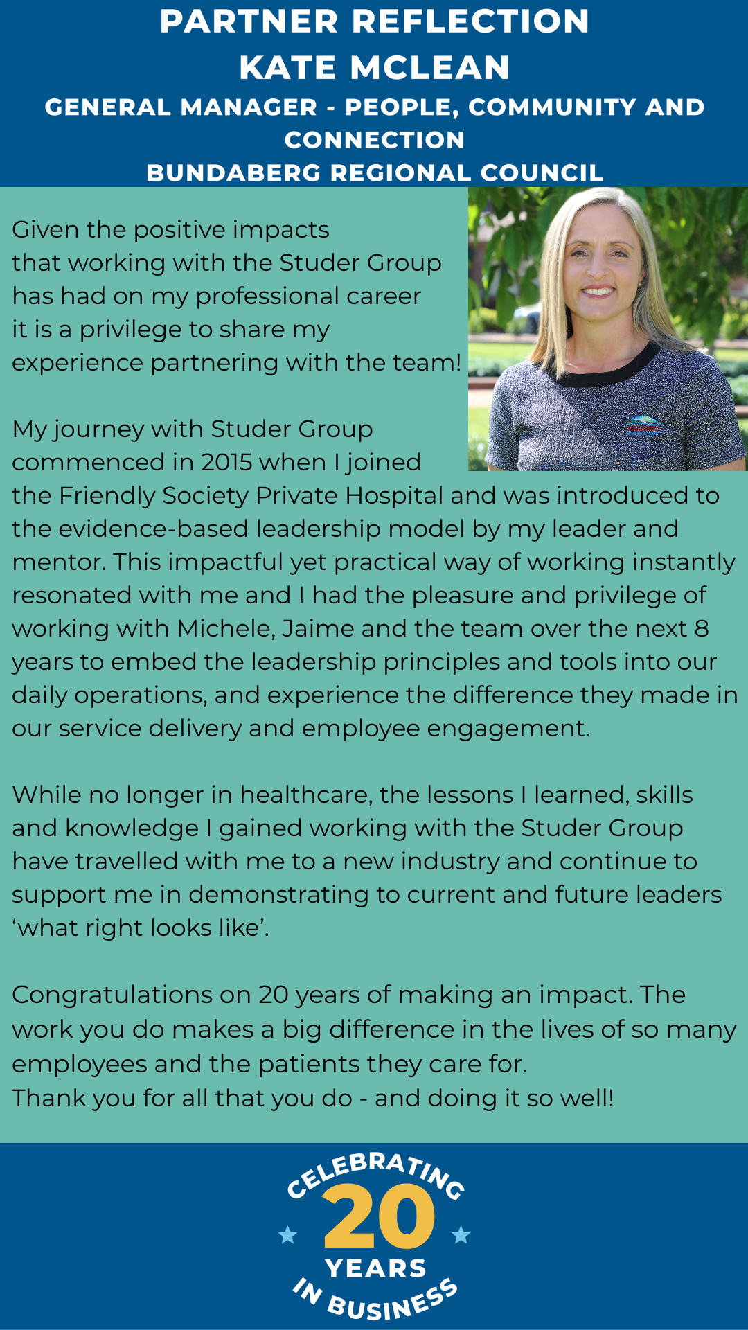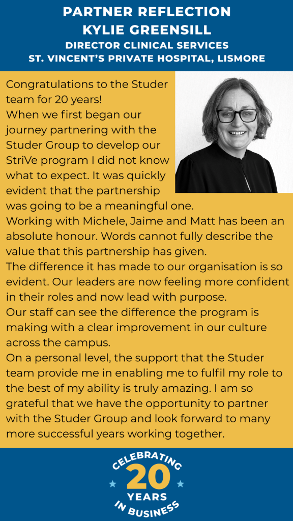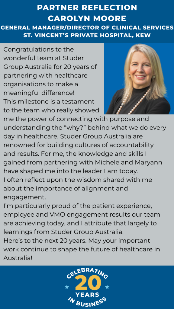 “In October of 2023, I assumed the role of CEO at St Vincents Private Hospital, Lismore. My first action was to announce the adoption of Studer Group as our Leadership Framework. Having previously implemented Studer Group 12 years prior at the Friendly Society Private Hospital in Bundaberg, I was fully aware of how effective this framework is in turning and guiding Values based culture. The early establishment of a new Strategic Plan with clear Vision and Values, was paramount in implementing one of the many Studer Group tactics such as “Above and Below the Line Behaviour” to engage with employees and doctors and build a culture of Accountability. In less than one year, we have seen a substantial positive cultural change, where the Nine Principles® guide decision making, employees are expressing a renewed passion for change and our expert Studer Group Coaches keep us moving along our planned journey. Studer Group is a proven universal Evidence-Based Leadership℠ strategy which has been the framework for my management for the past 13 years.”