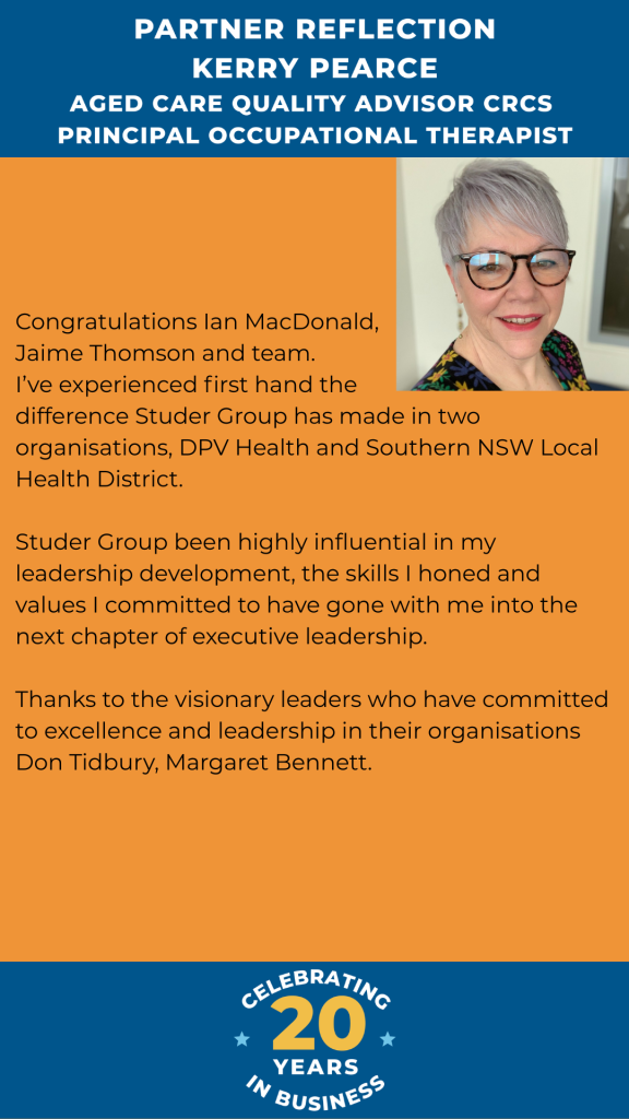 “The Studer Group’s “Hardwiring Excellence Program” has played an integral role in DPV Health’s transformation into one of Victoria’s leading Community Health organisations. Over the last five years, the Studer Group coaches have worked closely with DPV Health to implement a range of coaching and leadership programs to grow the capability, confidence and skills of DPV Health’s leaders. In doing so, DPV Health has seen tremendous uplifts in all performance metrics including client experience, employee engagement and retention, clinical governance, innovation, activity management and financial stewardship. I’m delighted to recommend the Studer Group to anyone seeking to drive major improvements in their organisation’s performance and culture.”