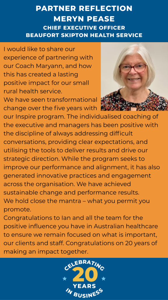 “At Maryborough District Health Service we pride ourselves on our Studer Group program, titled Good to Great (G2G) program as our cornerstone for staff engagement, clinical improvement and strong customer satisfaction. The expertise of coaching, and the tools and tactics available enable both organisational, professional and personnel growth and development. Today our values genuinely live within the organisation. We proudly live and breathe these values in our actions and words. Our staff connections, our communications and ability to continuously improve are greatly enhanced through this program and its tools and tactics. I often refer to Studer Group as the rudder. As we implement Studer Group, we are steering in the right direction.”